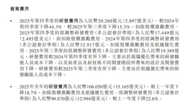 财报暴露,2025年第四季度,蔚来的研发用度为20.26亿元,较2024年第四季度下跌44.3%、较2025年第三季度下跌15.3%;全年的研发用度为106.05亿元,较上一年度下跌18.7%。