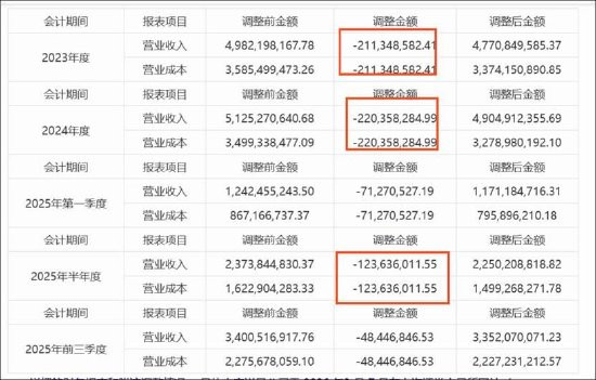 本次前期管帐特地更正及追思颐养触及公司已败露的2023年年度敷陈、2024年年度敷陈、2025年第一季度敷陈、2025年半年度敷陈及2025年第三季度敷陈,其中23年年报多计收入2.11亿元、2024年多计收入2.22亿元、2025年上半年多计收入1.23亿元。