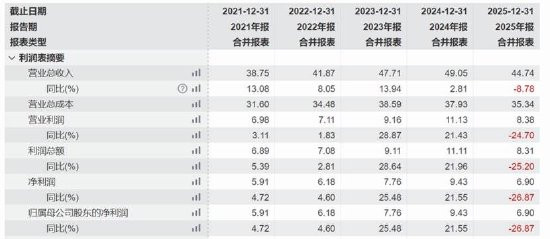 2025年年报自大,山东药玻营业总收入为44.74亿元,同比着落8.78%;归母净利润为6.9亿元,同比着落26.87%;扣非净利润为6.58亿元,同比着落27.13%。