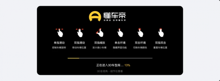 举例懂车帝的 3D 车型库加载场景,因需要加载复杂的 3D 模子和空间内容,恭候时候相对较长,居品在进程条上方展示 6 个手势操作教学(双指滑动、单指旋转、双击切换等),既收拢了用户的禁锢力,又让用户在干涉功能前提前掌抓操作法式,省去了后续的单独操作教学,栽植了举座使用成果。