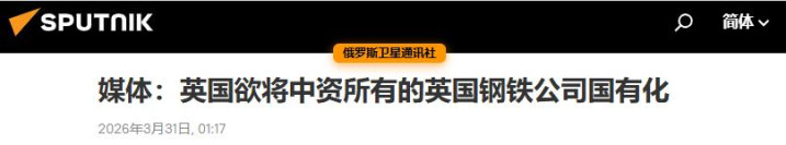 1.《媒体:英国欲将中资统共的英国钢铁公司国有化》2026-03-31 01:17 | 开端:俄罗斯卫星通信社