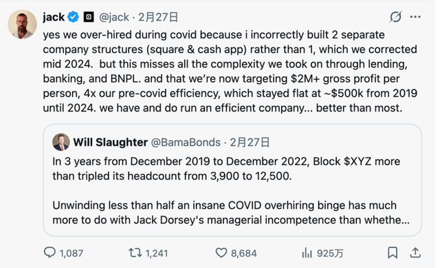 濒临质疑,Dorsey在X平台松了口,承认疫情时代舛讹拆分公司架构,导致东说念主员严重冗余。