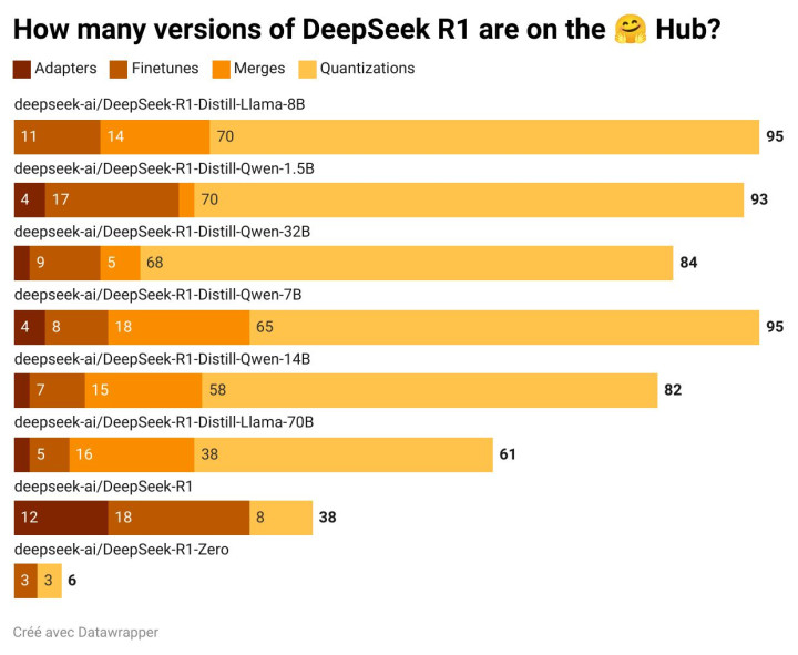 围绕DeepSeek-R1,巨匠开荒者还张开了二次开荒,并在HuggingFace推出量化版、蒸馏版、推理优化版等多种滋生版块。数据自满,DeepSeek-R1发布仅一周,社区滋生版块就突破550个,关系模子累计下载量达数百万次。