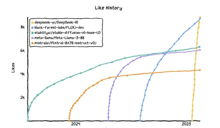 DeepSeek-R1凭借比好意思头部闭源模子的推理才调,加上宽减弱源条约、可绝对复现的时期细节,俄顷收拢了HuggingFace社区核心用户的珍见地。