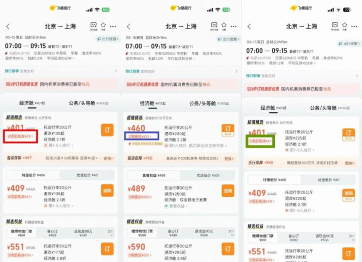 记者3月11日(左图红框)、3月12日(中间蓝框)、3月14日(右图绿色)搜索机票时的价钱刻画不断发生变化。