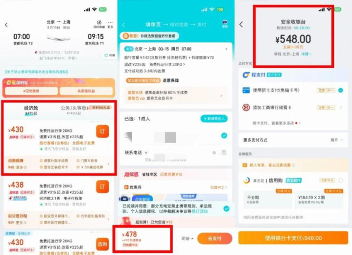 在去哪儿APP,排行前两位保举的选项下方都有小字“+XX”元的退票保障或航空无意险。点击插足第一个大字显现430元选项,下一级说明页面显现的是价钱478元(基础价钱442元+退票保障价钱48元-个东谈主优惠券12元),辅以小字“+70机建燃油”。果真插足支付页面时,则是加上机建燃油后的548元,最终价钱说明相对不了了。