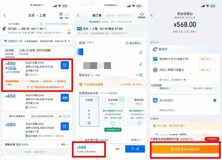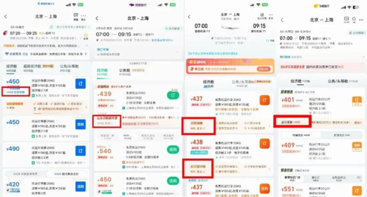 在携程旅行APP,被置于首位保举的选项以较大字体标注450元,但在点进下一页面后,显现的最终支付价钱为568元,撤退70元的机建燃油用度,还默许附带了48元的“万能保障做事”,而这一附带产物在首页仅仅以“+48元”的小字显现。