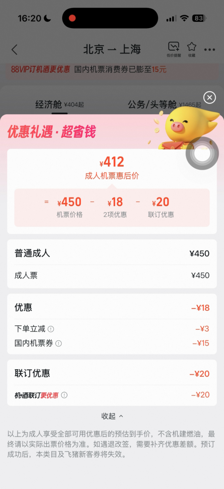 但在这几个狡计步调里,看似都和领先显现的404元没干系系。记者狡计发现,404元的得出是由450元基础票价和“4项最至高减46元”的所谓“优惠”相减组成,即上述26元的优惠加上20元的机酒连订优惠。