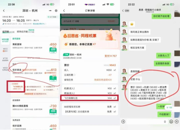 3月7日,邓女士在同程旅行平台预订了3月10日从深圳飞往杭州的机票,并采取了显耀标有“廉价首选”的613元的选项。但插足到支付枢纽时,应对金额被拉高至757元。