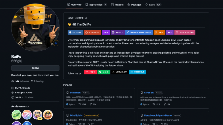 故事的主东说念主公叫郭航江,在GitHub上,他的主页名是BaiFu。从个东说念主简介来看,他就读于北京邮电大学,主要编程语言是Python,历久照顾深度学习、大语言模子、图计较以及智能体系统。往日几个月,他把大部分元气心灵齐放在智能体架构遐想与实质应用场景探索上。