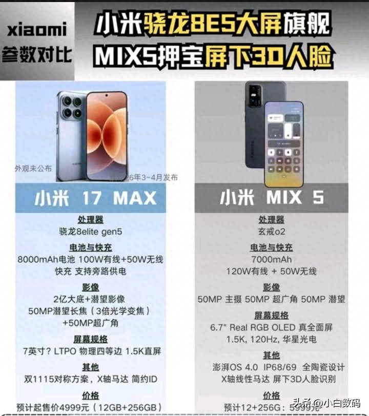 2026年3月,小米旗下探索旗舰MIX系列最新机型MIX5预测将于同庚7月崇拜发布。这款承载着小米十年时代千里淀的居品,将以多项禁闭性更动从头界说高端智高手机圭臬,其中最引东说念主贵重确当属大众首款屏下3D东说念主脸识别时代的量产哄骗,以及自研玄戒O2芯片的深度整合。