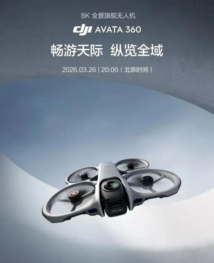 四、据最新的官宣信息,大疆将于2026年3月26日20:00发布DJIAVATA3608K旗舰全景无东谈主机。据网上爆料:大疆Avata360将搭载双1/1.1英寸CMOS传感器,支握360°全景模式与单镜头模式的双形态拍摄将配备O4图传,竣事更远的图传距离以及愈加恬逸、明晰的画面传输弘扬;支握遥控器与体感两种操控方法。