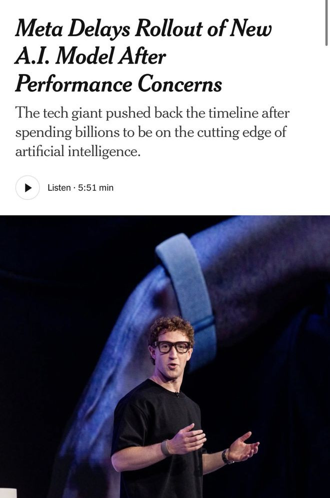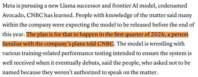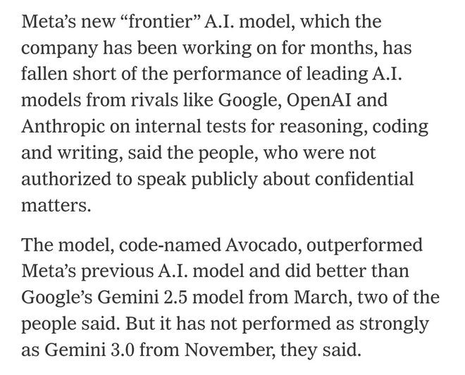 刚刚,《纽约时报》征引三位里面知情东说念主士音讯:Meta的AI模子「牛油果」(Avocado)展期了。