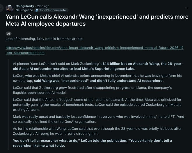 一个顶级东说念主才,在拿走14亿和逃离Meta之间,绝不徜徉地秉承了后者。