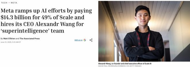 2025年6月,扎克伯格晓喻以143亿好意思元收购ScaleAI约49%的股权,拿真金白银换来一个东说念主——ScaleAI独创东说念主、28岁的AlexandrWang(汪滔)。