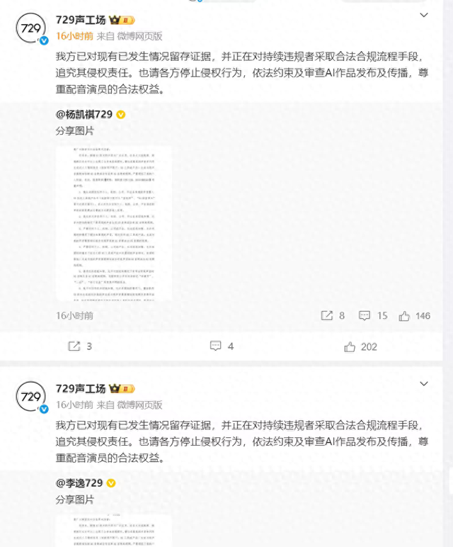 3月13日,从当日下昼到傍晚,国内著名配音公司729声工场旗下接连二十余位配音演员集体发函,公开表态遏抑AI配音侵权,其中包括谷山河、杨天翔、张福正、赵爽、孙路路、郭浩然等多位著名配音演员。