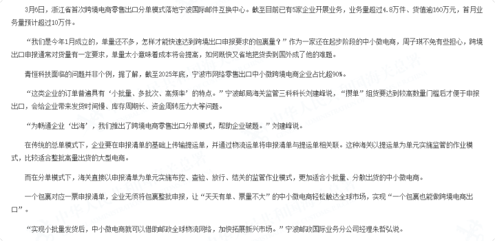 2026年3月初,跟着一批包含1.1万余件衣帽鞋服、日用百货的包裹在宁波国际邮件互换中心告成验放启运,浙江省首个跨境电商零卖出口“分单花式”认真宣告落地。